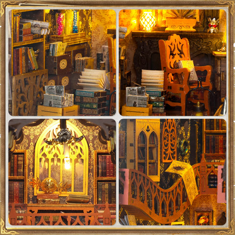 Beim Blick ins Innere wirst du sofort von der Detailfülle überrascht: kunstvolle Regalreihen, stapelweise Bücher in verschiedenen Farben und Größen, filigrane Schnitzereien und kleine Dekorationen, die wie Erinnerungen vergangener Abenteuer wirken. Die geschwungene Galerie, das gotische Fenster und der nostalgische Kamin schaffen eine Atmosphäre, die zugleich mystisch, gemütlich und inspirierend ist.