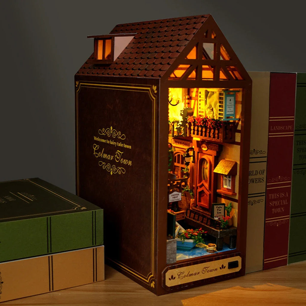 Der Aufbau des Book Nook Colmar Town verbindet französische Romantik mit kunstvoller Holzarbeit. Die LED-Beleuchtung taucht die Szene in goldenes Licht, wodurch Fenster, Türen und das Fachwerk der Häuser noch realistischer wirken. Eine Oase der Ruhe, perfekt als Blickfang in jedem Regal oder als Geschenk für Liebhaber französischer Dörfer und Miniaturkunst.