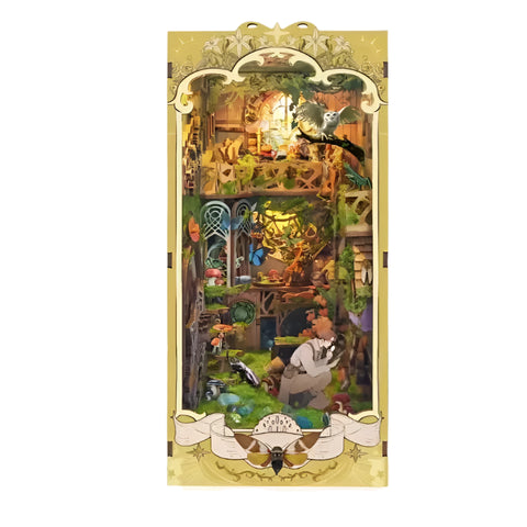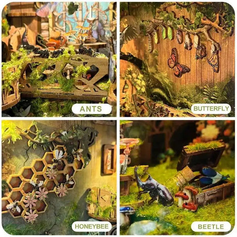 Mit dem Book Nook Forest öffnest du ein verborgenes Kapitel mitten in deiner Bücherwand: ein winziges Naturkundelabor, in dem Ameisenstraßen beobachtet, Schmetterlinge gezüchtet, Honigbienen studiert und geheimnisvolle Käfer gesammelt werden. Zwischen Moos, Wurzeln und Holzstegen entsteht eine lebendige Szene, die aussieht, als würde der Naturforscher nur kurz seinen Notizblock holen, bevor er weiterarbeitet.