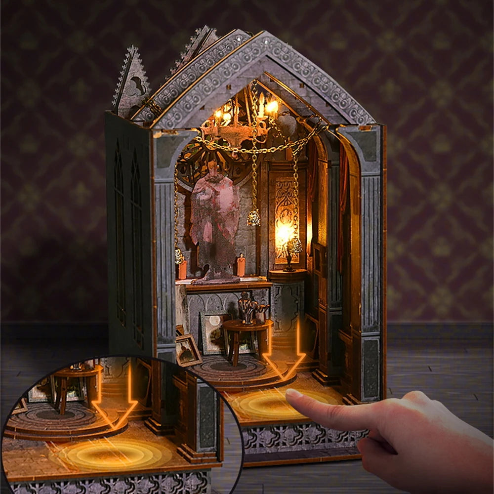 Beim Zusammenbauen fügen Sie Dutzende präzise geschnitzter Holzelemente zu einer beeindruckenden Miniaturwelt zusammen. Das Ergebnis ist nicht nur eine dekorative Buchstütze, sondern ein kunstvolles Diorama, das Bücherregale verzaubert und jeden Besucher innehalten lässt. Das Book Nook Gothic Heiligtum ist ein kleines Tor zu einer anderen Zeit – düster, mystisch, wunderschön.