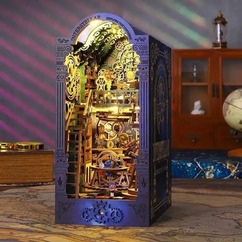Mit dem Book Nook Interstellar öffnest du ein Fenster in eine fantastische Raumstation, in der Astronomie, Mechanik und Magie miteinander verschmelzen. Warmes Licht fällt auf komplexe Sternenkarten, schimmernde Globen und filigrane Zahnräder, die wirken, als würden sie den Lauf des Universums selbst steuern.