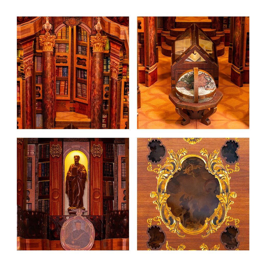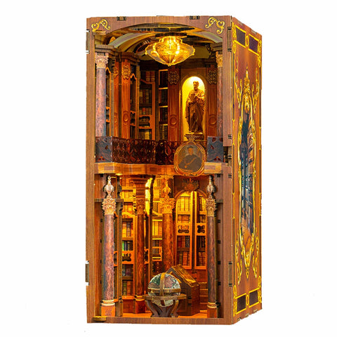 Mit dem Book Nook Library öffnest du die Tür zu einer majestätischen Welt voller Geschichte, Literatur und stiller Ehrfurcht. Dieses kunstvolle Miniatur-Diorama lässt dich eintreten in eine altehrwürdige Bibliothek, in der goldene Säulen, rundbogige Galerien und unzählige alte Bücher im warmen Licht eines Kronleuchters erstrahlen.