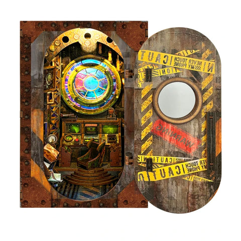 Mit dem Book Nook Nautilus holst du dir das Herz eines legendären U-Boots direkt ins Bücherregal. Hinter einer schweren, rostigen Metallluke öffnet sich ein detailreicher Kommandoraum: geschwungene Stufen, Steuerpulte, Anzeigen und Rohre – alles in warmen Messing- und Kupfertönen, als würdest du selbst gleich Kurs auf die Tiefsee setzen.