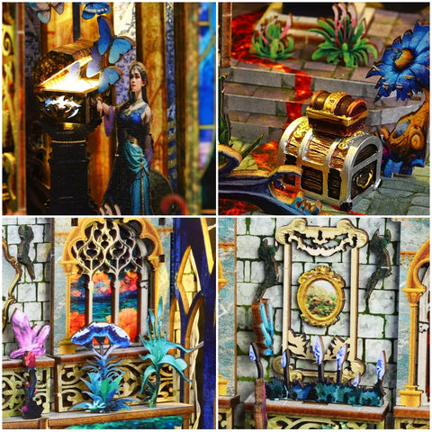 Mit dem Book Nook Pandora öffnest du ein prunkvolles Portal in eine magische Dimension voller Geheimnisse, leuchtender Pflanzen und verborgener Schätze. Hinter kunstvoll geschnitzten Bögen, verzierten Rahmen und schimmernden Kristallornamenten entfaltet sich eine märchenhafte Szene, die aussieht, als wäre sie einem alten Fantasyroman entsprungen.
