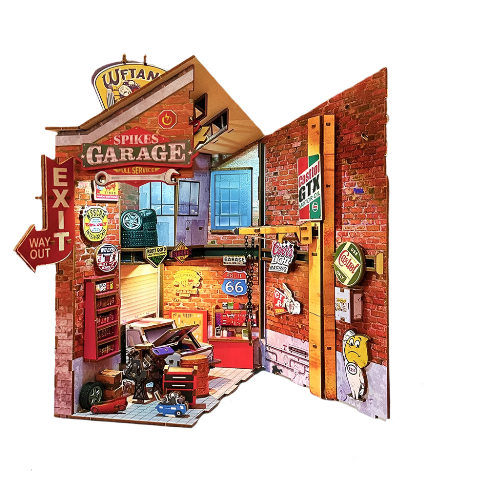 Mit dem Book Nook Retro Werkstatt öffnest du die Tür zu einer alten Autowerkstatt, in der der Duft von Motoröl, Metall und Abenteuer in der Luft liegt. Sobald das Licht angeht, wird die Szene lebendig: Neonreklamen flackern, Werkzeuge hängen ordentlich an der Wand, und das Herz der Garage – ein halb zerlegter Motorblock – wartet darauf, wieder zum Brüllen gebracht zu werden. Dieser kleine Raum erzählt Geschichten von Leidenschaft, handwerklichem Geschick und echten Schraubermomenten.