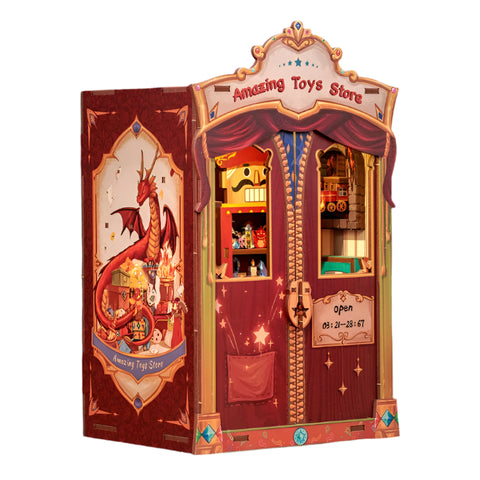 Mit dem Book Nook Spielzeugladen öffnest du die Tür zu einem Laden, der nur in Kinderträumen existiert: Vorhänge wie auf einer Theaterbühne, ein wachender Drache auf der Fassade und Regale voller kleiner Wunder. Sobald das warme Licht angeht, wirkt es, als hätte der Besitzer den Laden nur kurz verlassen – und jedes Spielzeug könnte jederzeit zum Leben erwachen.