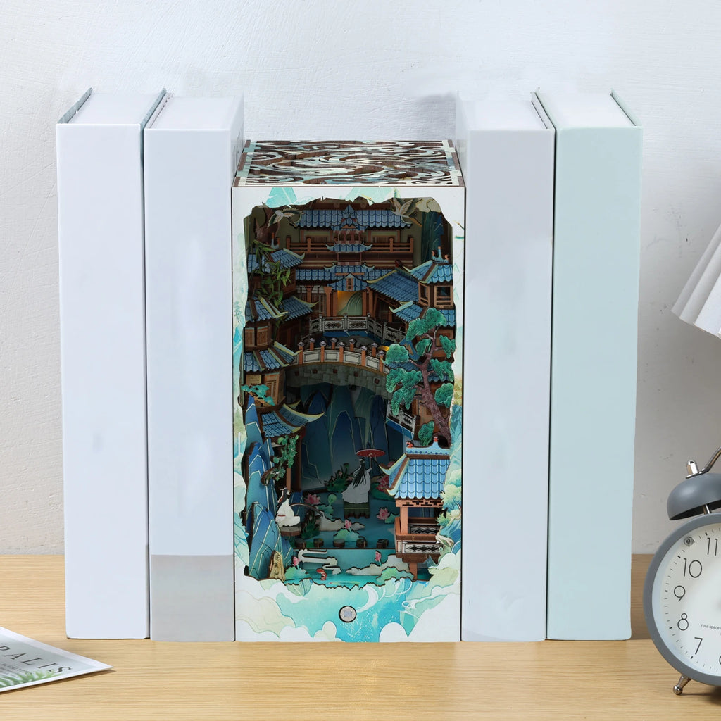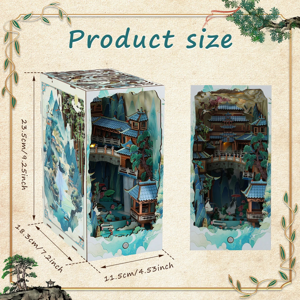 Die Tiefe des Dioramas ist beeindruckend: Auf mehreren Ebenen erheben sich Tempel, Brücken und Terrassen, sodass sich ein echtes 3D-Panorama ergibt. Beleuchtet wirkt der Bergtempel fast magisch – als würde ein spirituelles Licht aus den Höhlen und Hallen der verborgenen Welt hervordringen. Der Book Nook Versteckte Bergtempel verwandelt jedes Bücherregal in einen Ort der Stille und des Staunens.
