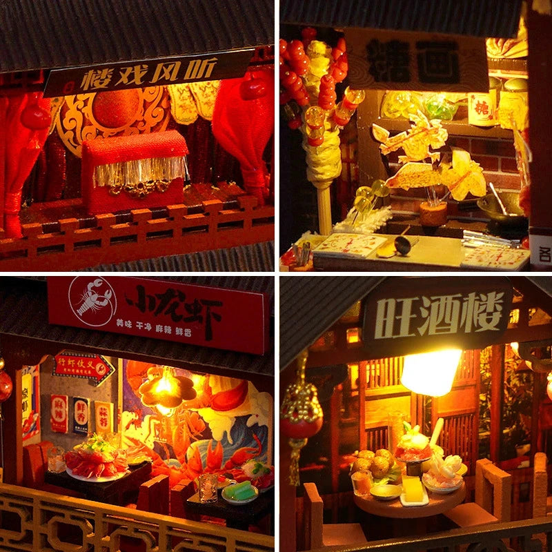 Links und rechts der Gasse reihen sich Restaurants, Imbissstände und Verkaufsstände aneinander: gegrillte Köstlichkeiten, dampfende Suppen, kandierte Früchte, kleine Bühnen mit Vorhängen und zahlreiche Dekorationen schaffen ein einzigartiges Straßenfest-Gefühl. Die warmen Lichter, traditionellen Schriftzeichen, Holzfassaden und filigranen Fensterrahmen verleihen der Szene eine Tiefe, die aussieht, als würde jeden Moment ein neuer Besucher um die Ecke kommen.
