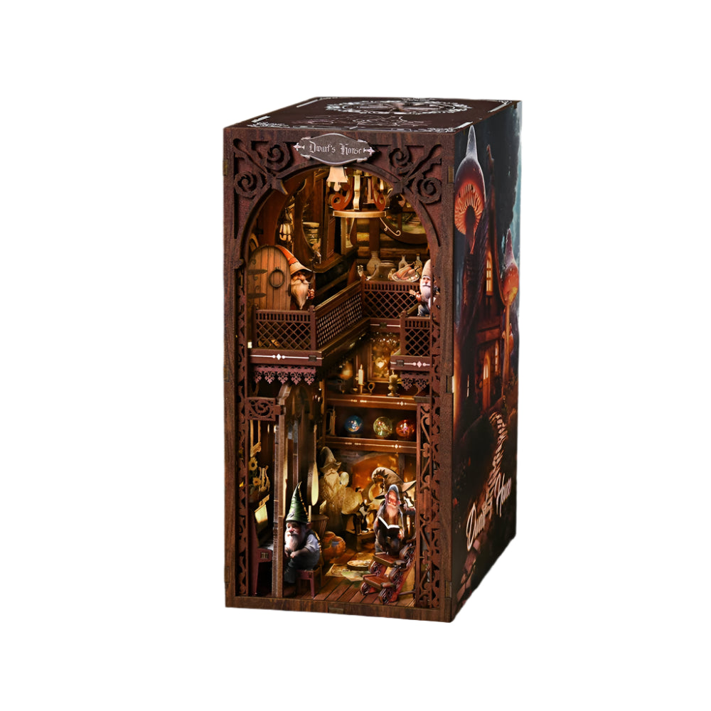 Mit dem Book Nook Zwergenhäuschen öffnest du eine Tür in eine warme, gemütliche Welt voller kleiner Waldwesen. Am Eingang empfängt dich der Schein eines Kaminfeuers, während Zwerge lesen, werkeln und musizieren – eine Szene, die direkt aus einem alten Märchen entsprungen scheint.