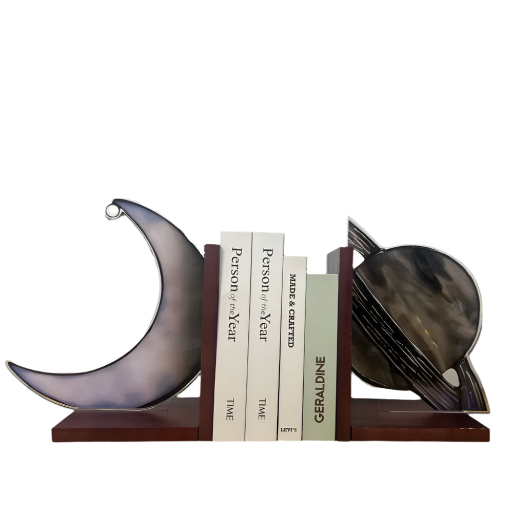 Auf der einen Seite erhebt sich ein elegant geschwungener Halbmond mit glänzender Oberfläche, auf der anderen thront ein stilisierter Saturn mit seinen feinen Ringen – beide meisterhaft gefertigt und auf einem soliden Holzsockel montiert. Die Kombination aus dunklem, sattem Holz und galaktischer Formensprache macht diese Buchstütze zu einem echten Hingucker für alle, die Astronomie lieben oder einfach einen Hauch Fantasie in ihre Einrichtung bringen möchten.