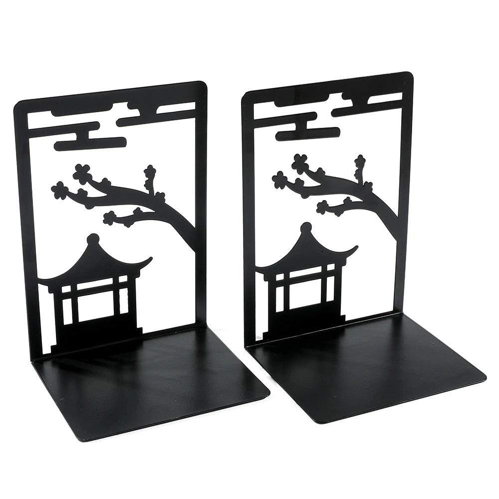 Dieses Paar kunstvoller Buchstützen bringt die heitere Atmosphäre eines Zen‑Gartens auf Ihre Bücherregale. Gefertigt aus stabilem Metall und ganz in Schwarz gehalten, erinnern die filigranen Silhouetten an traditionelle japanische Tempel, in denen Gelassenheit und Konzentration zuhause sind. Jede Stütze bildet ein kleines Haus mit offenen Linien, durch die Licht und Schatten ein beruhigendes Spiel eingehen – genau wie beim Umblättern einer Seite.
