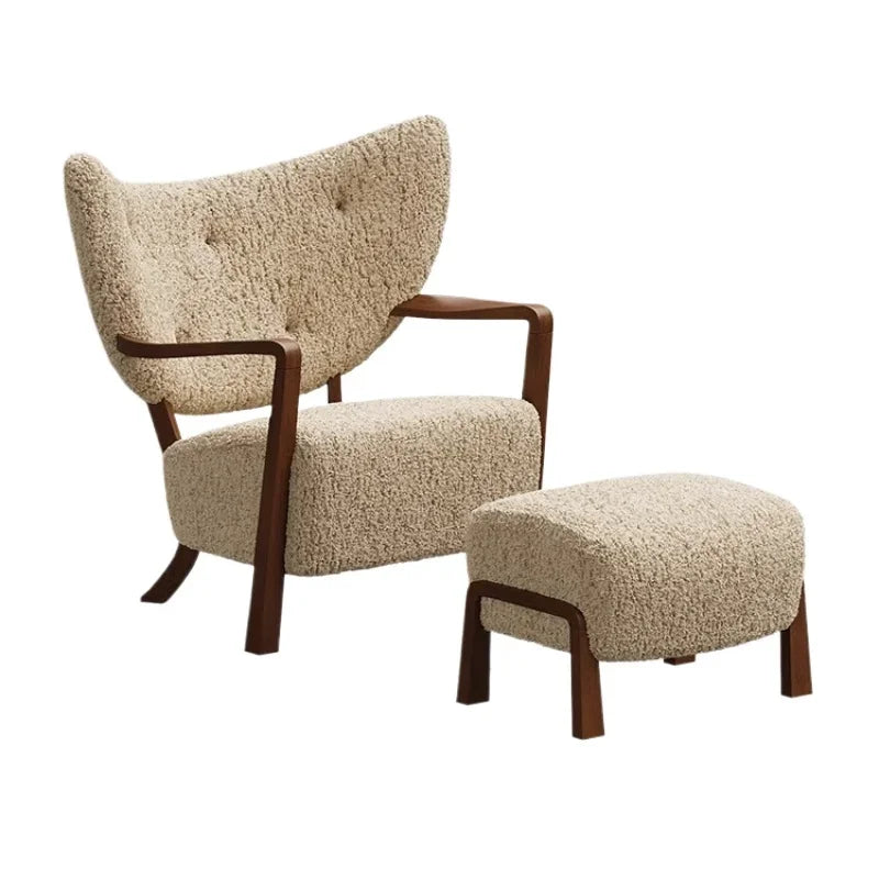Die feine Verarbeitung in Kombination mit den geschwungenen Armlehnen aus massivem Holz sorgt für eine stilvolle Ausstrahlung und außergewöhnliche Stabilität. Der passende Hocker rundet das Set ab und bietet die Möglichkeit, die Beine bequem hochzulegen. Ob im Wohnzimmer, Schlafzimmer oder im Arbeitsbereich – dieser Sessel bringt eine harmonische Mischung aus Design, Komfort und Funktionalität in Ihr Zuhause.