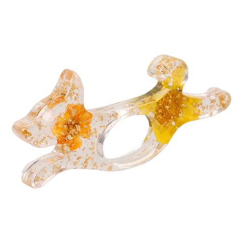 Gefertigt aus transparentem Kunststoff, mit goldenen Flocken und gepressten Blüten durchzogen, ist dieser Lesering nicht nur praktisch, sondern auch ein echter Blickfang. Die Silhouette des Hundes – mit erhobener Rute und verspielter Haltung – verleiht dem Design Leichtigkeit und Charakter.