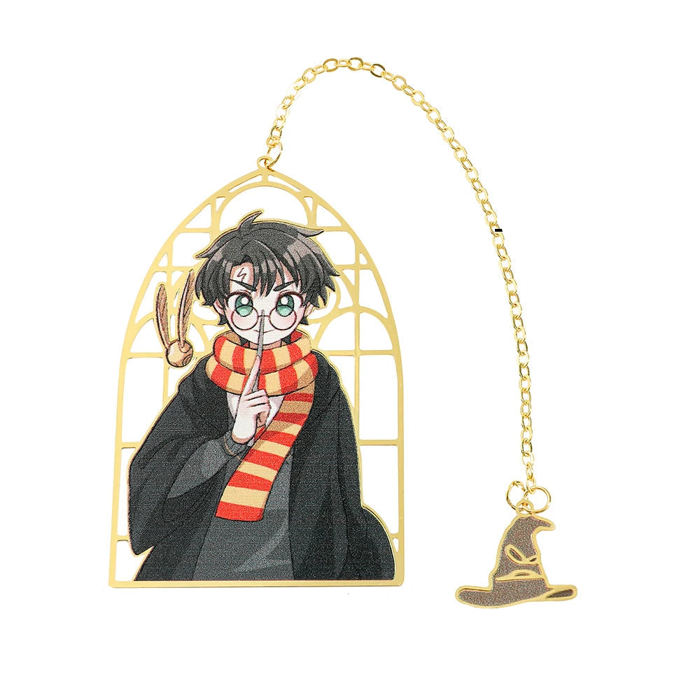 Das filigrane Fensterrahmen-Design aus Edelstahl verleiht dem Lesezeichen eine edle, fast kirchenartige Wirkung – als würdest du einen Blick in die geheimnisvolle Welt von Hogwarts werfen. Die goldene Kette mit Anhänger in Form des Zauberhuts rundet das Design perfekt ab und macht dieses Accessoire zu einem echten Schatz für Fans und Sammler.