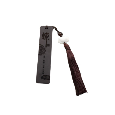 Die dunkle Holzfläche ist mit filigranen Zeichen und Mustern verziert, die eine Aura der Gelassenheit schaffen. Ein edler, langer Quastenanhänger in warmem Braun sorgt dafür, dass das Lesezeichen sofort ins Auge fällt und gleichzeitig einen Hauch von Ritual in jede Lesestunde bringt. Abgerundet wird das Design durch einen weißen Schmuckstein, der Reinheit und Balance symbolisiert.