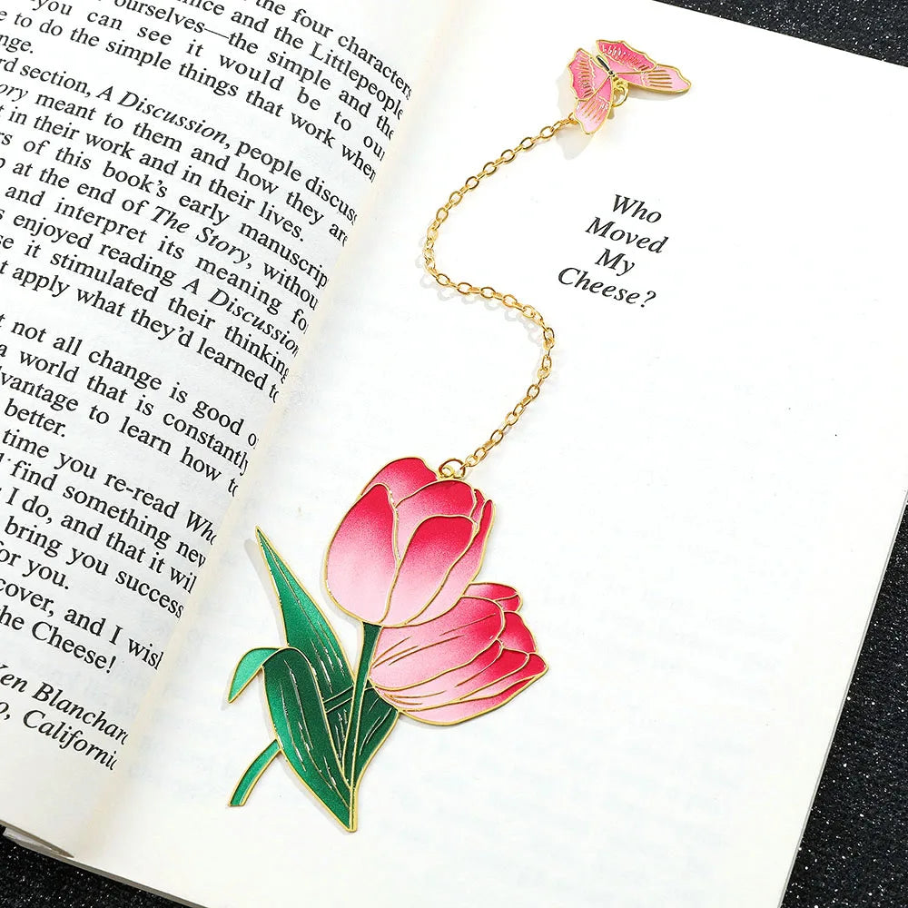 Das Lesezeichen Blumen bringt die Zartheit der Natur direkt in Ihr Lieblingsbuch. Mit seinen detailreichen Tulpenblüten in zarten Rosa- und Rottönen erinnert es an einen blühenden Frühlingsgarten, in dem ein Schmetterling sanft über die Blüten schwebt. Dieses kunstvolle Design macht jede Lesepause zu einem besonderen Moment der Entspannung.