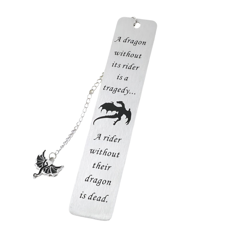 Das Lesezeichen Drachenbund erzählt eine Geschichte von Treue und Schicksal. Mit der Inschrift „A dragon without its rider is a tragedy… A rider without their dragon is dead.“ bringt es die tiefe Verbindung zwischen Mensch und Drache auf poetische Weise zum Ausdruck.
