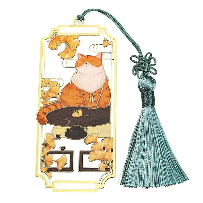 Das Lesezeichen Teekater vereint die Ruhe des Lesens mit der Gelassenheit einer entspannten Katze. Mit seiner goldfarbenen Umrahmung, den verspielten Ginkgo-Blättern und der dekorativen Quaste wird dieses Lesezeichen zu einem echten Blickfang, der deine Bücher stilvoll begleitet.